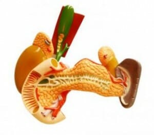 De alvleesklier of pancreas. In de buikspeekselklier liggen cellen die pancreassap produceren en deze in