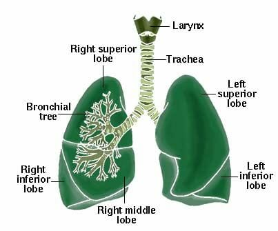 In de borstkas splitst de luchtpijp zich in de twee hoofdbronchi (luchtpijptakken) waarvan de wanden kraakbeenstukjee bevatten. Deze delen zich verder in bronchiën die de longkwabben voorzien. Er bevinden zich dus aan elke zijde, boven en onder, kwabbronchiën.