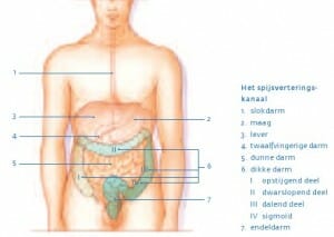 Het spijsverteringskanaal is een met slijmvlies bedekte spierbuis van ongeveer negen meter lengte, die loopt