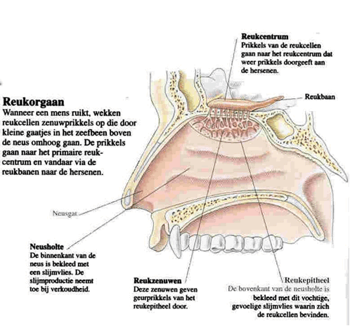 Het reukorgaan ligt aan het begin van de luchtwegen en neemt een gebied ter grootte van een kwartje in, aan de rand van de bovenste neusschelp en op het er tegenover liggende neustussenschot. Doordat het kleurstof (pigment) bevat, heeft het reukgebied een gele kleur en steekt het daardoor af bij het eromheen liggende rode slijmvlies.…
